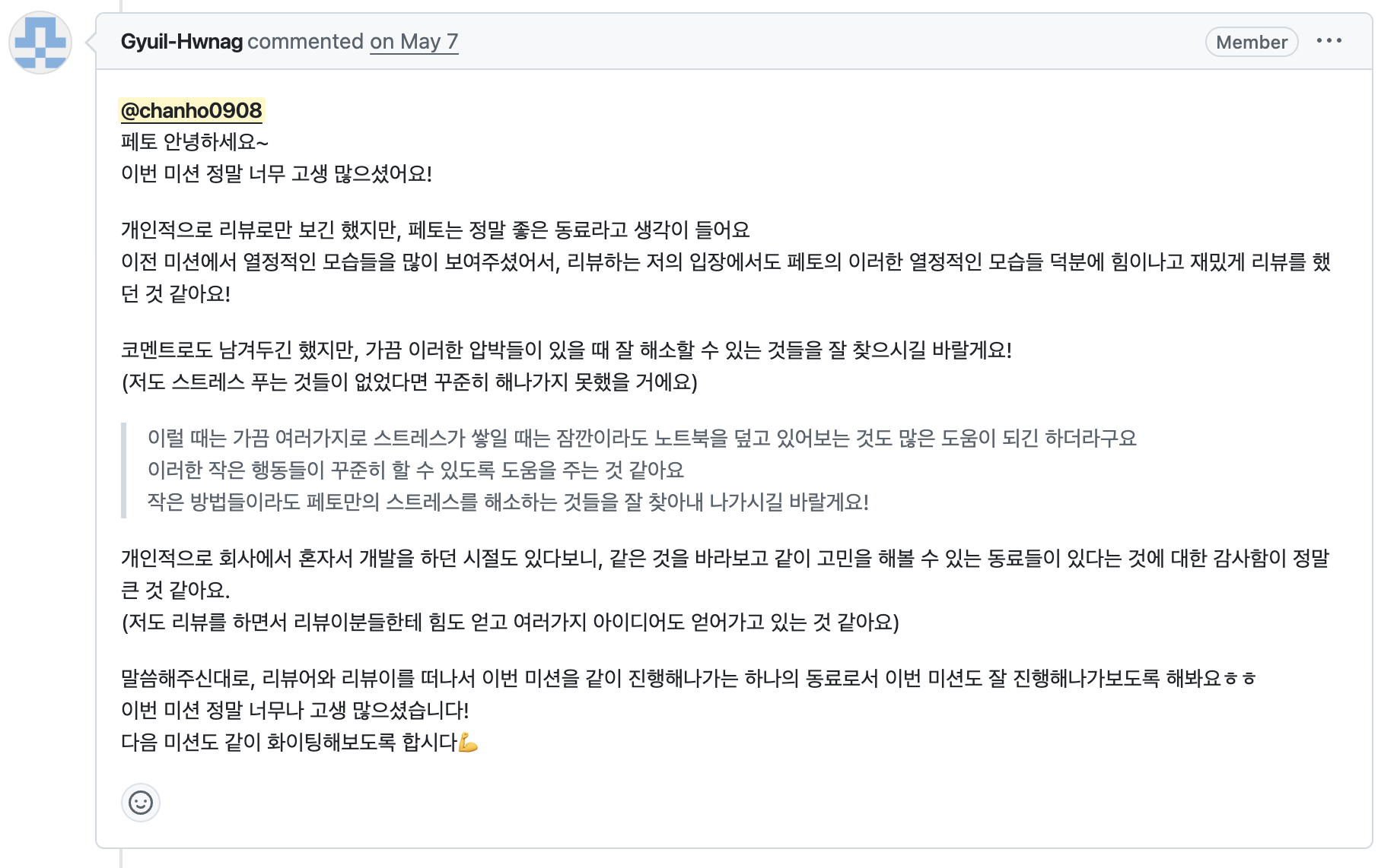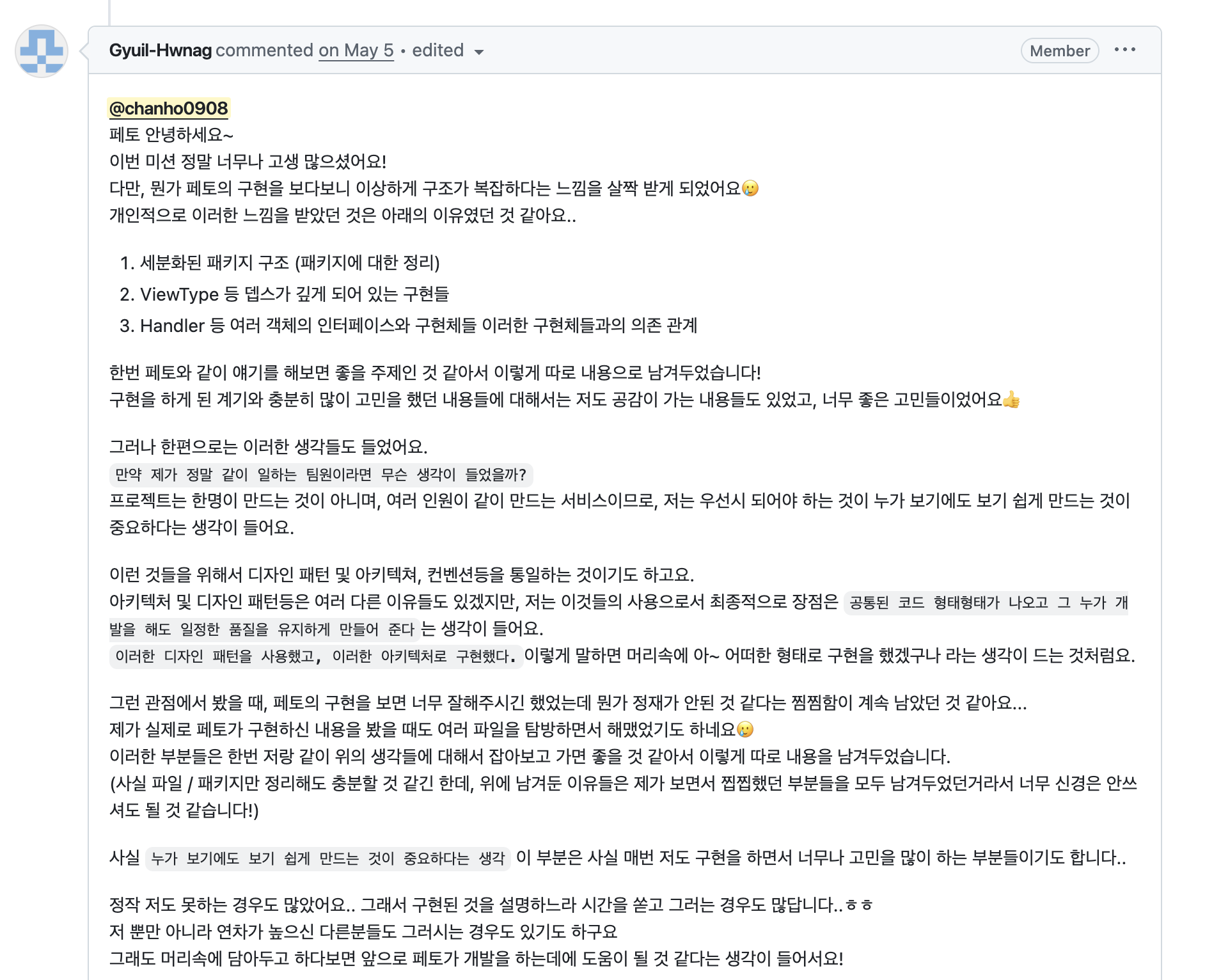 그 이유야 어찌 됐건 멘토라는 목표를 가진 놈이 저런 생각을 하다니 미친놈이다. 스스로 정말 많이 후회하고 또 반성했다. 그래서 마음가짐을 고쳐먹고 언젠가 내가 멘토링을 할 그날에 내 모습을 연습한다는 마음가짐으로 임하며 도움을 드렸다. 그랬더니 오히려 내가 더욱 몰입하고 더 열정적으로 임하게 되었고 그 결과 크루분의 코드를 본인보다 내가 더 잘 알게 되어 버렸다.