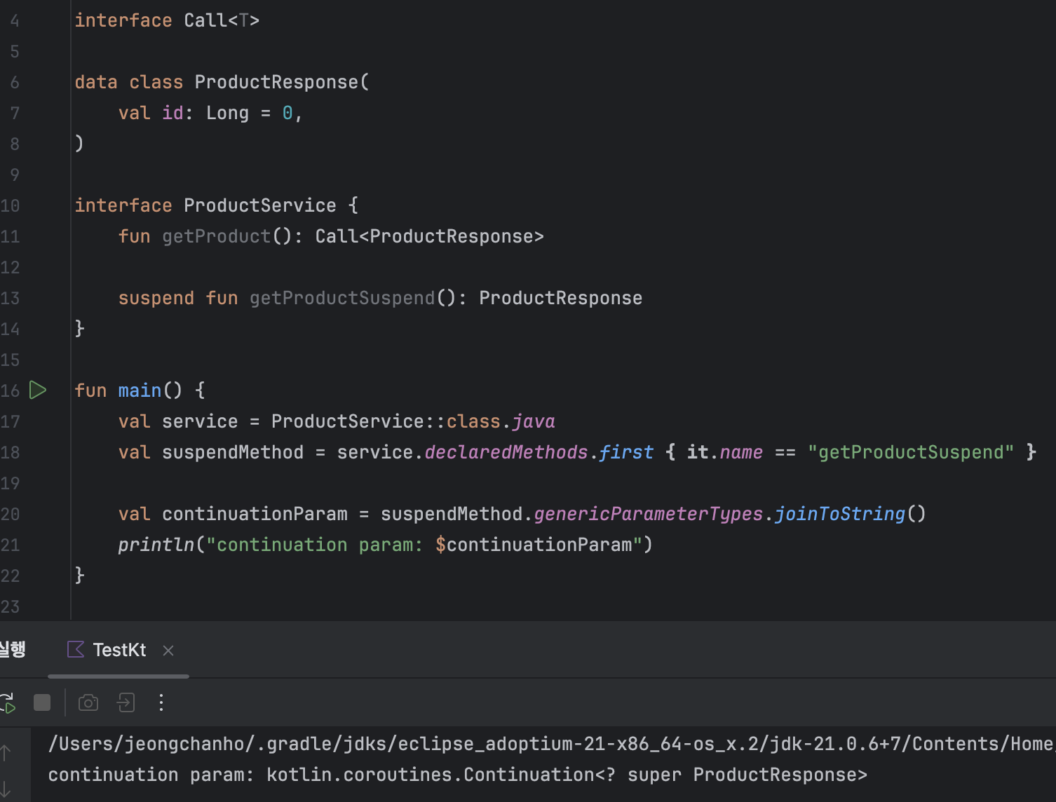 이 과정을 예시 코드로 보면 ProductResponse 이거나 그 상위 타입을 받아들일 수 있는 코루틴 Continuation<? super ProductResponse>으로 반환됩니다.