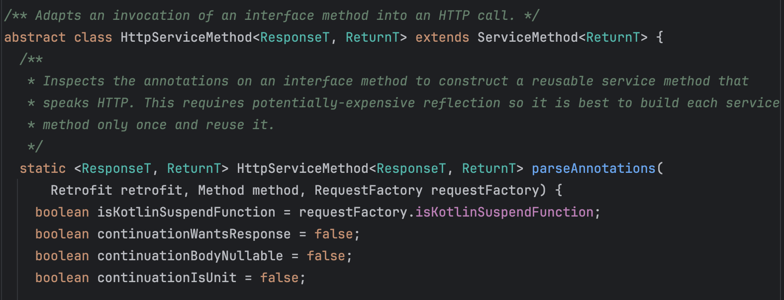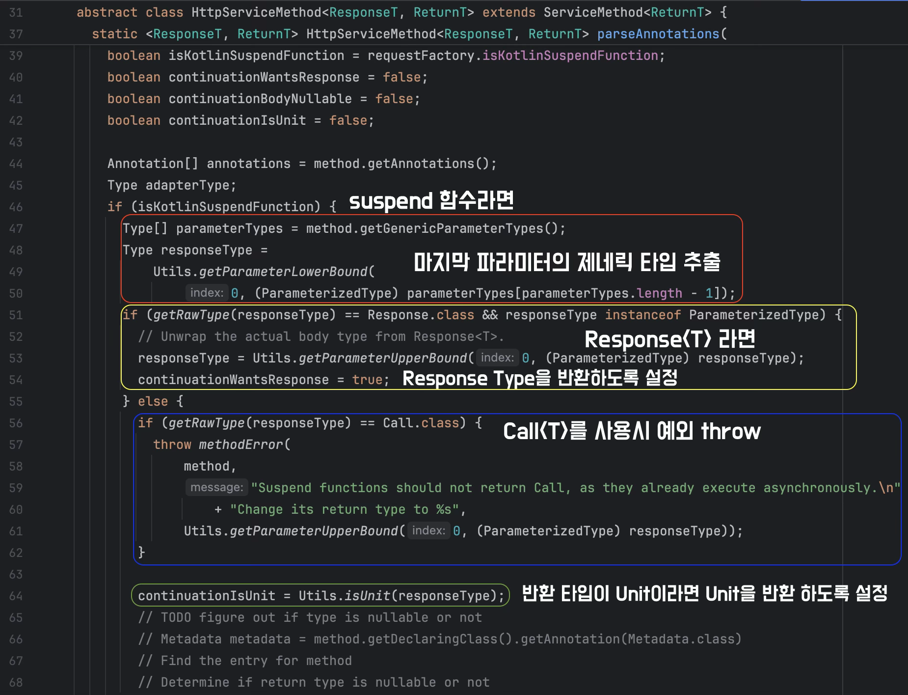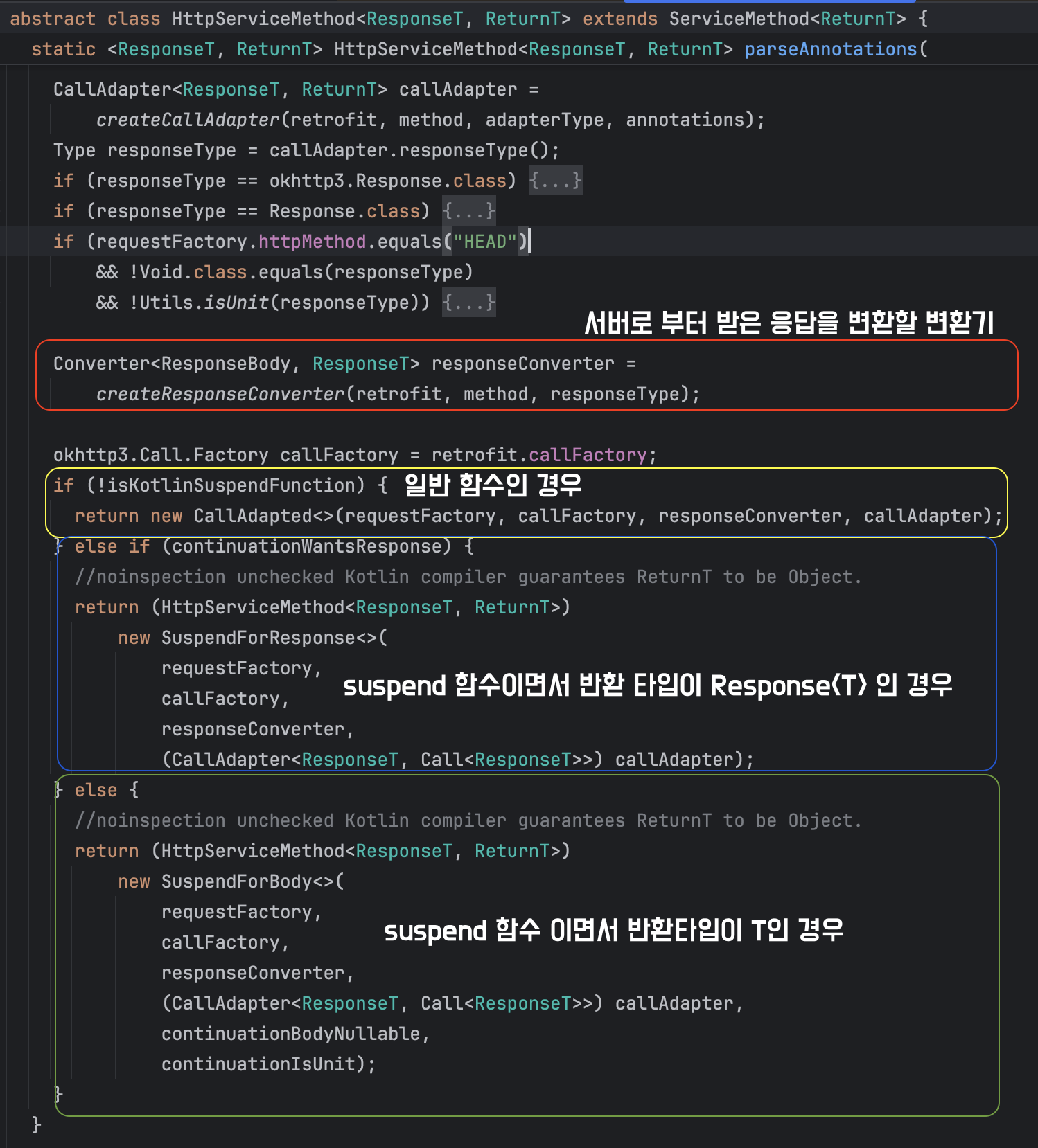 RequestFactory 내에서 suspend 함수를 판별하는 원리를 이해했으니 다시 돌아와서 HttpServiceMethod가 이를 어떻게 활용하는지 이해해 보겠습니다.