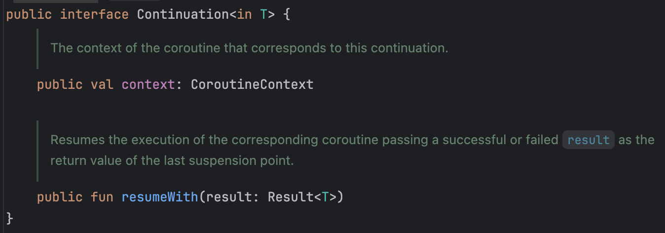suspend 함수는 컴파일 시 마지막 인자로 Continuation <T> 객체를 받는 형태로 변환됩니다. Continuation은 코루틴의 실행 상태를 저장하고 재개할 수 있도록 도와주는 인터페이스입니다. suspend 함수가 일시 중단되면 해당 지점을 기억하고, 이후 resumeWith를 통해 중단된 곳부터 다시 실행을 이어갈 수 있습니다.