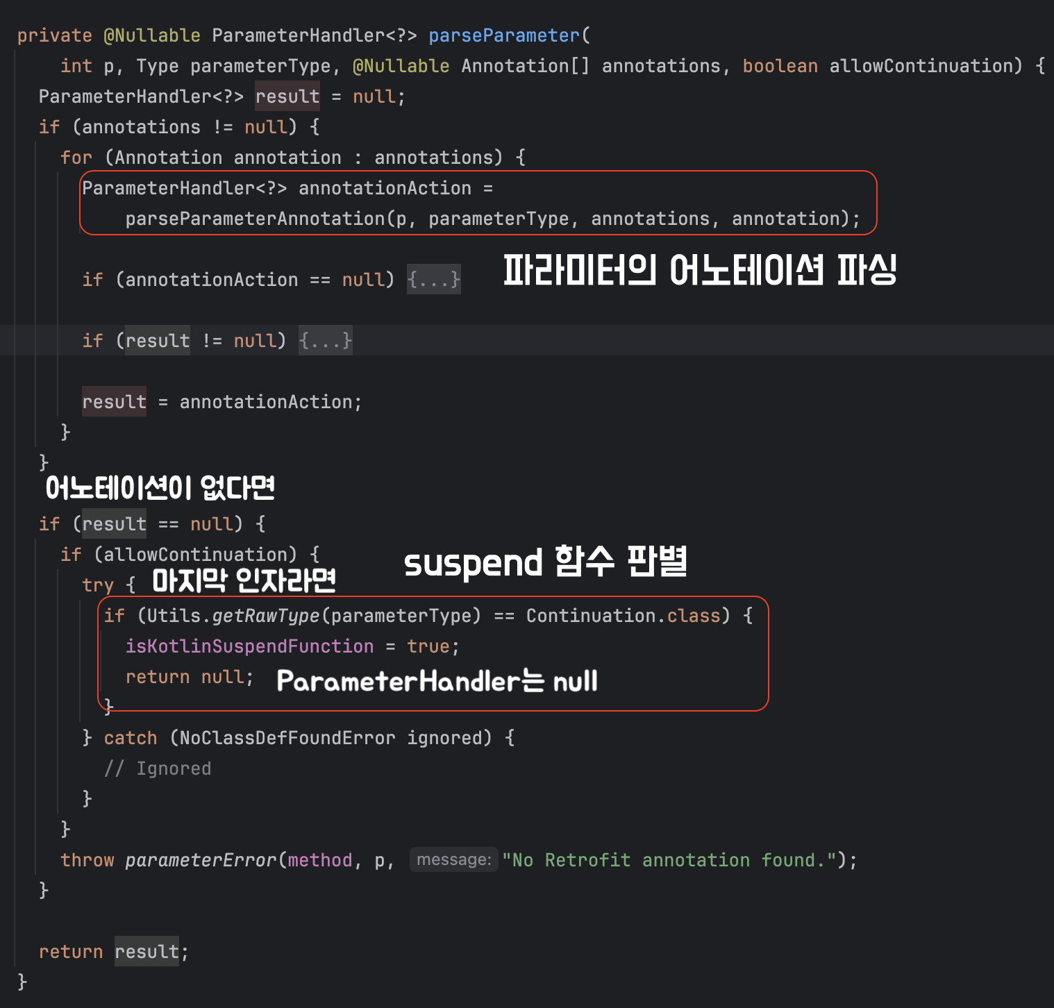 parseParameter 메서드는 parseParameterAnnotation을 호출해 파라미터에 붙은 Retrofit 어노테이션(@Query, @Path 등)을 파싱 하고, 이에 대응하는 ParameterHandler 객체를 생성합니다.