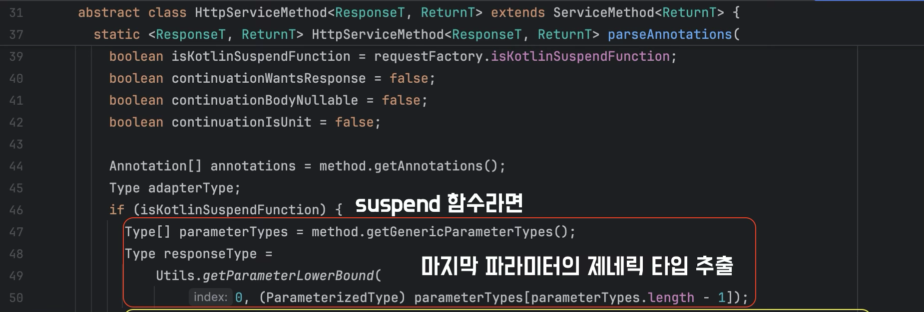 먼저 46번째 라인에서 suspend 함수 여부에 따라 분기합니다. 만약 suspend 함수일 경우 리플렉션을 사용해 메서드의 제네릭 타입 파라미터를 가져옵니다.