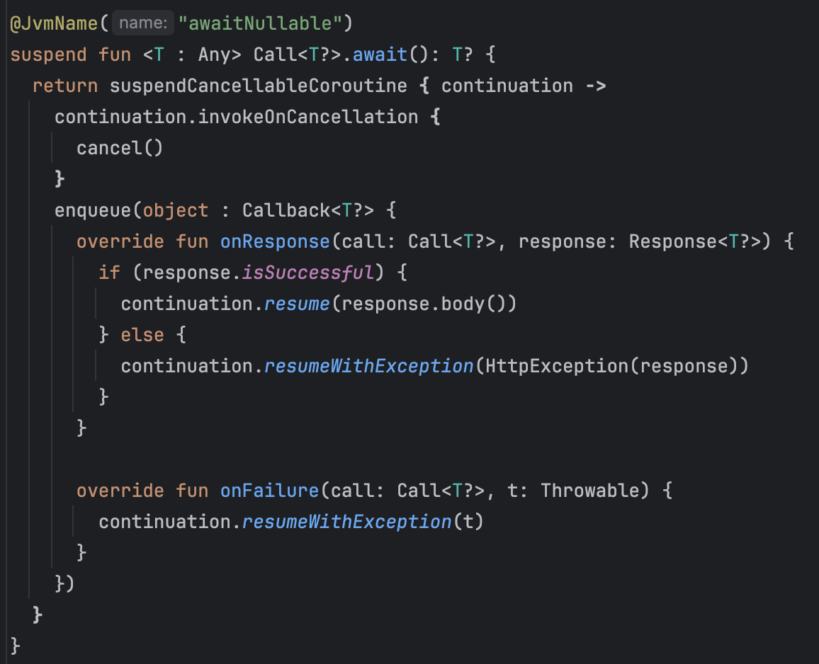 awaitNullable의 전체적인 구조는 awaitResponse와 매우 유사하며 차이점은 Response <T?>에서 본문만 꺼내서 그대로 nullable 하게 반환한다는 점입니다.