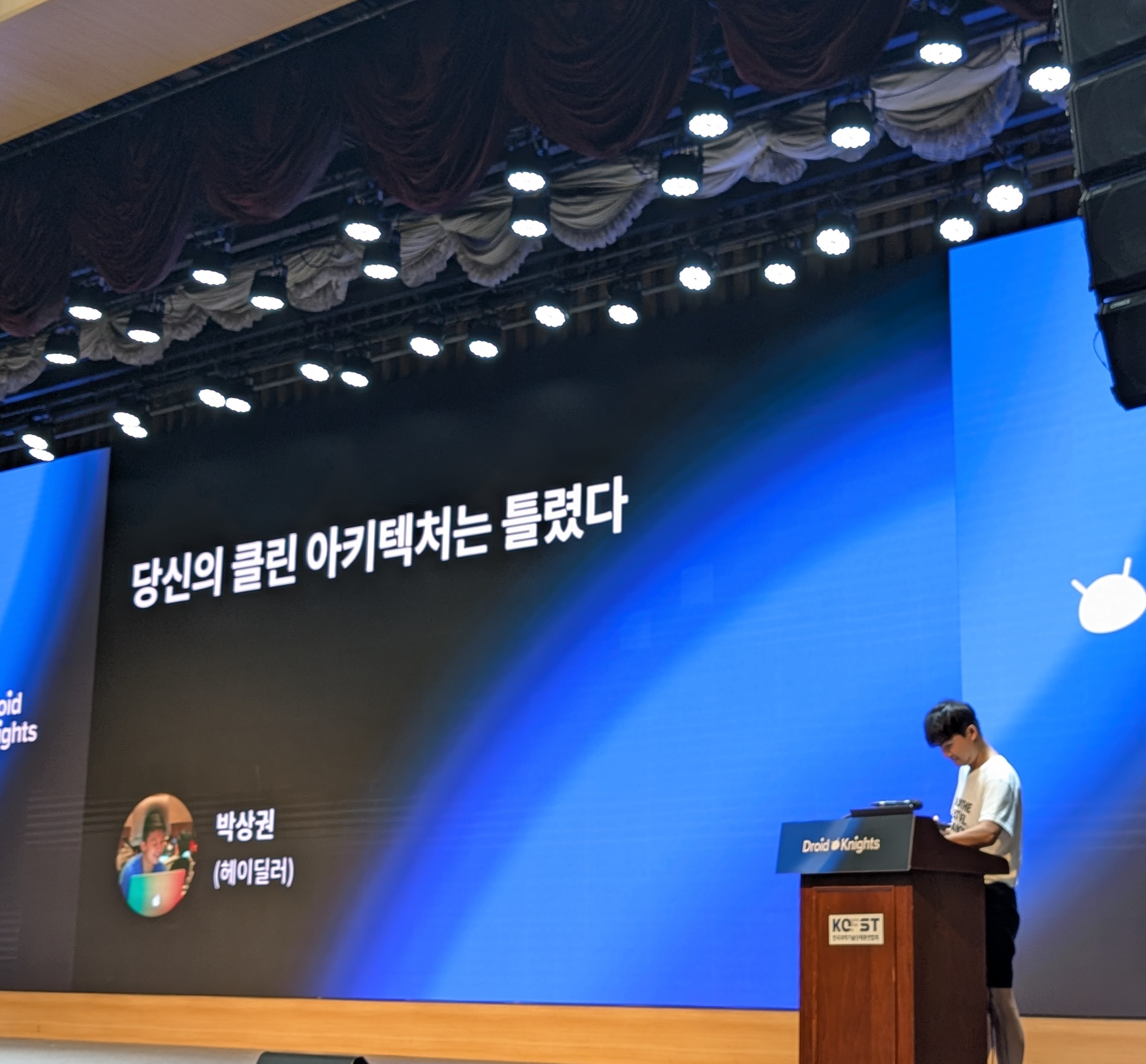 잠깐의 여유시간이 생겨 박상권님의 당신의 클린 아키텍처는 틀렸다 세션을 들을 수 있었다.😁 수많은 경력답게 발표에서 묻어 나오시는 여유는 정말 존경스러울 정도였다. 안드로이드 앱 아키텍처에서 도메인이 옵셔널인 이유는 repository를 호출하기만 하는 유즈케이스는 필요 없다는 의견 때문이라고 하셨는데 그렇다면 도메인 모델은 어디에 있어야 하는지 여쭤보고 싶었지만 다음 발표자분을 안내드리기 위해 다 듣지 못하고 나왔다.