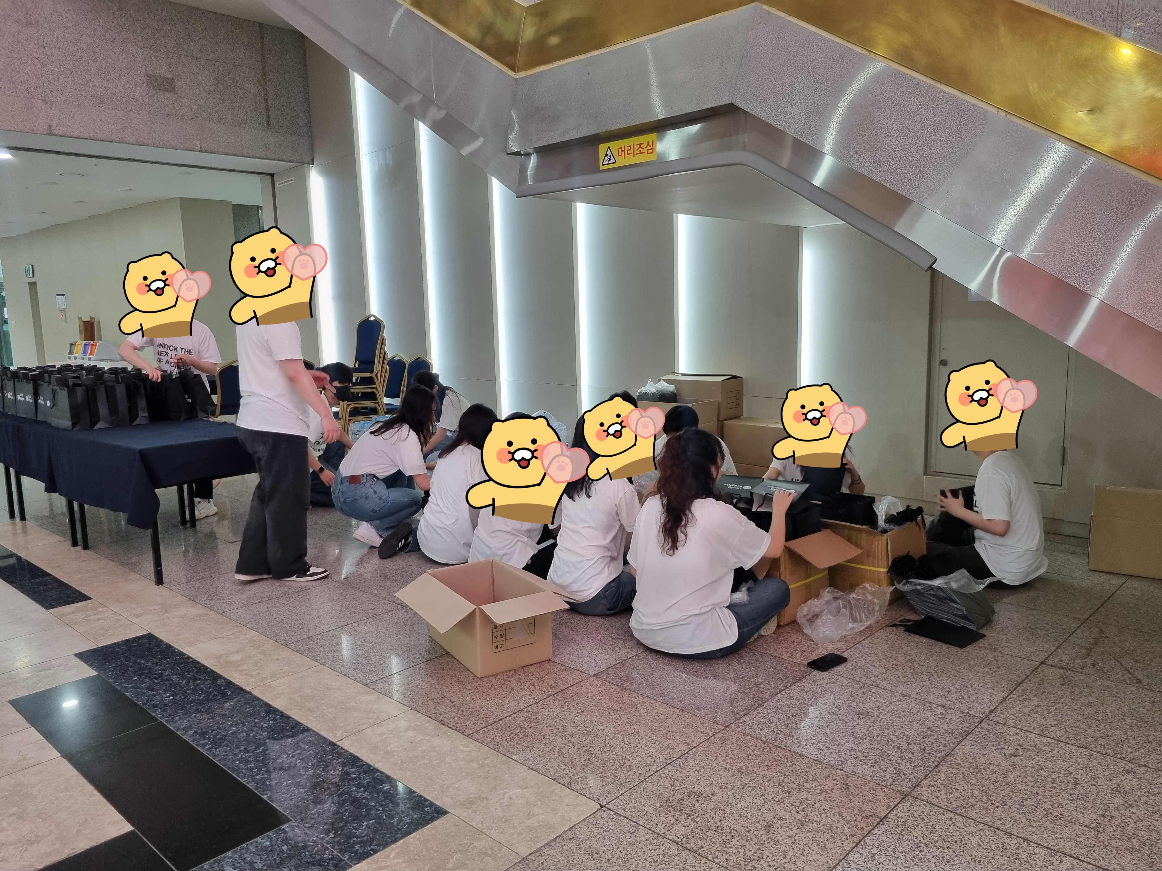 첫 임무는 굿즈 포장이었다. 임무를 부여받자마자 크루들과 함께 굿즈 공장을 개설(!)해서 폭풍처럼 굿즈 포장을 해냈다. 신기하게도 다들 처음 맞춰보는 사이인데도 손발이 척척 맞았다. 참가자 입장에서는 굿즈를 그냥 받기만 하면 끝이었는데, 그 뒤에서 이런 정성과 노고가 있다는 걸 처음 느꼈다. 그동안 내가 받아온 굿즈들이 새삼 다르게 느껴지는 순간이었다 🙇