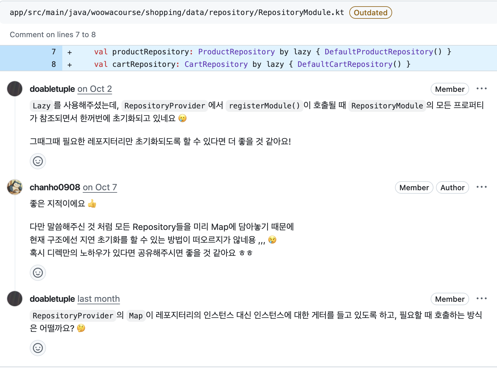 이를 조금 더 쉽게 설명하기 위해 우아한테크코스에서 수동 DI를 구현하는 미션을 예시로 들어보겠습니다. 저는 의존성 주입을 위한 Repository 객체들을 미리 초기화 해놓고 필요할 때마다 꺼내서 주입해 주는 방식으로 구현해 다음과 같은 리뷰를 받았습니다.