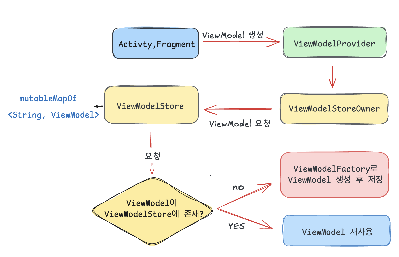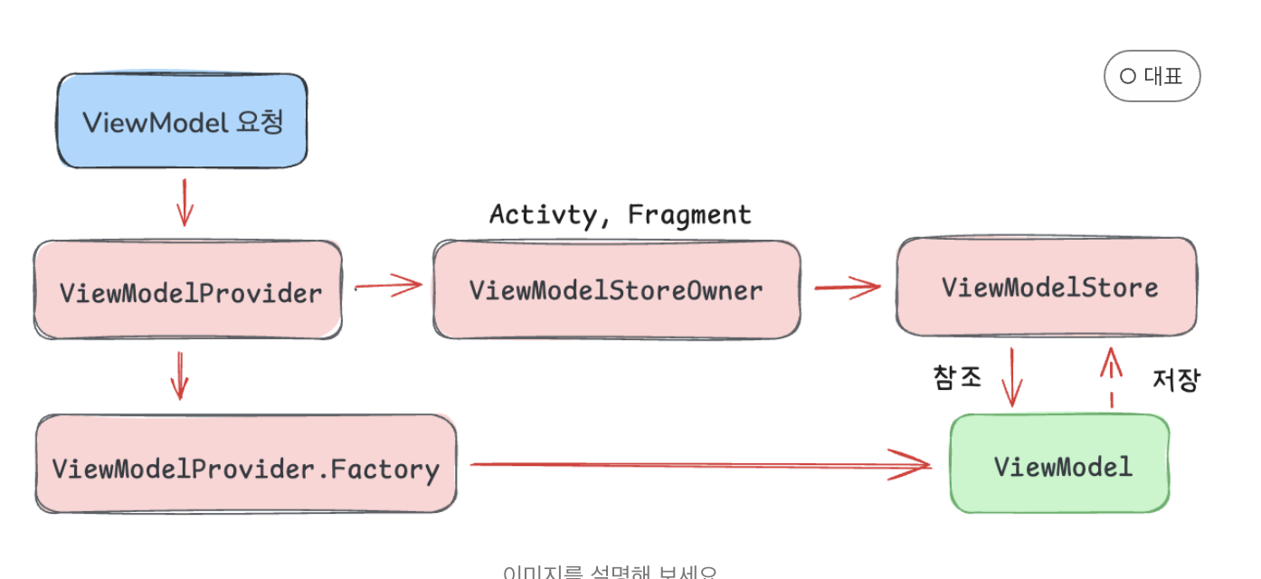 - Map을 사용해 저장하며 ViewModelProvider는 요청된 ViewModel이 ViewModelStore에 있으면 반환하고 없다면 새로 생성해 저장합니다