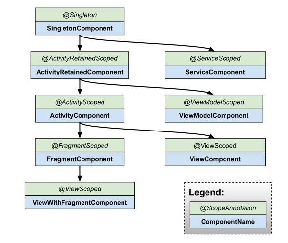 Hilt는 @Inject, @Provides, @Binds 등의 어노테이션을 기반으로 컴파일 시점에 의존성 관계를 분석하여 의존성 주입 코드를 생성하고 각 Component 마다 독립적인 의존성 주입 코드를 생성합니다. 이 코드에는 다음 정보가 담겨있습니다.
