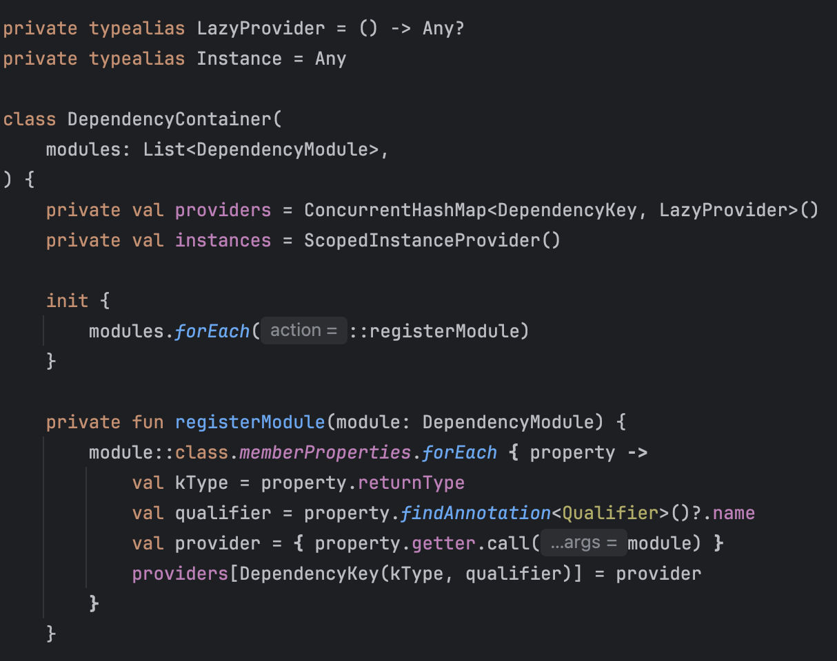 이후 의존성을 주입할 때 인스턴스가 이미 있다면 그대로 반환하고 만약 없다면 생성해서 저장하도록 구현했습니다. 해당 코드는 여기서 확인하실 수 있습니다.