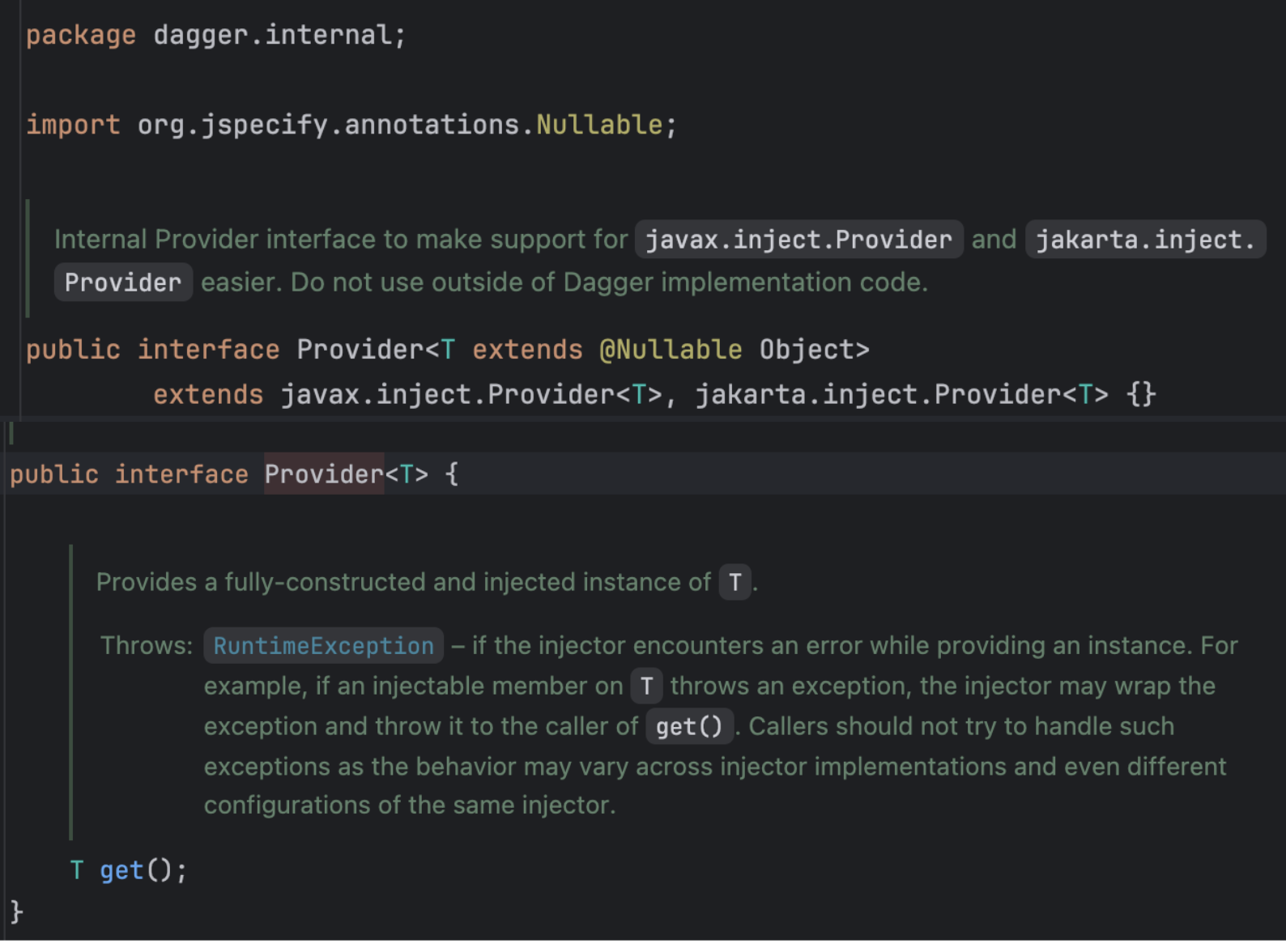 Hilt는 필요한 의존성을 Provider 형태로 관리합니다. Provider란 실제 인스턴스를 직접 들고있는게 아니라 필요할 때 꺼내쓸 수 있도록 지연 생성을 지원하는 래퍼입니다. 즉, 의존성 주입 위해 인스턴스들을 모두 미리 초기화해 들고 있는게 아니라 get()이 호출되는 시점에 실제 인스턴스를 가져옵니다.