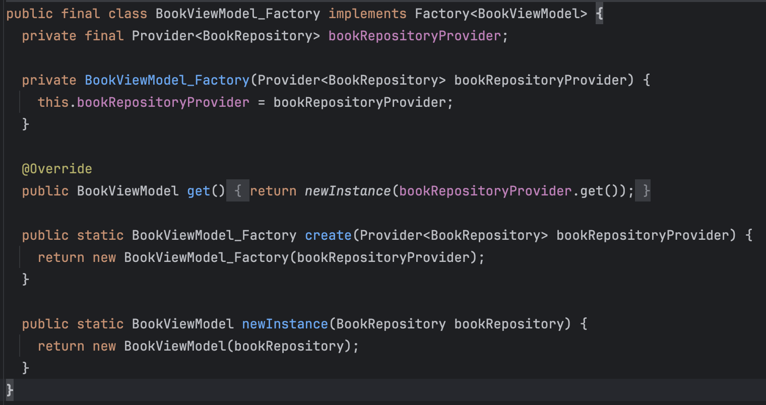 Hilt가 컴파일 타임에 생성한 클래스들입니다. 이를 통해 첫 번째 마법의 비밀이 드러나게 되었습니다. Hilt는 컴파일 타임에 ViewModel을 생성하기 위한 ViewModelFactory를 생성합니다. 필요한 의존성을 Provider를 통해 주입받고 newInstance()를 호출해 VIewModel을 생성하는 형태입니다.