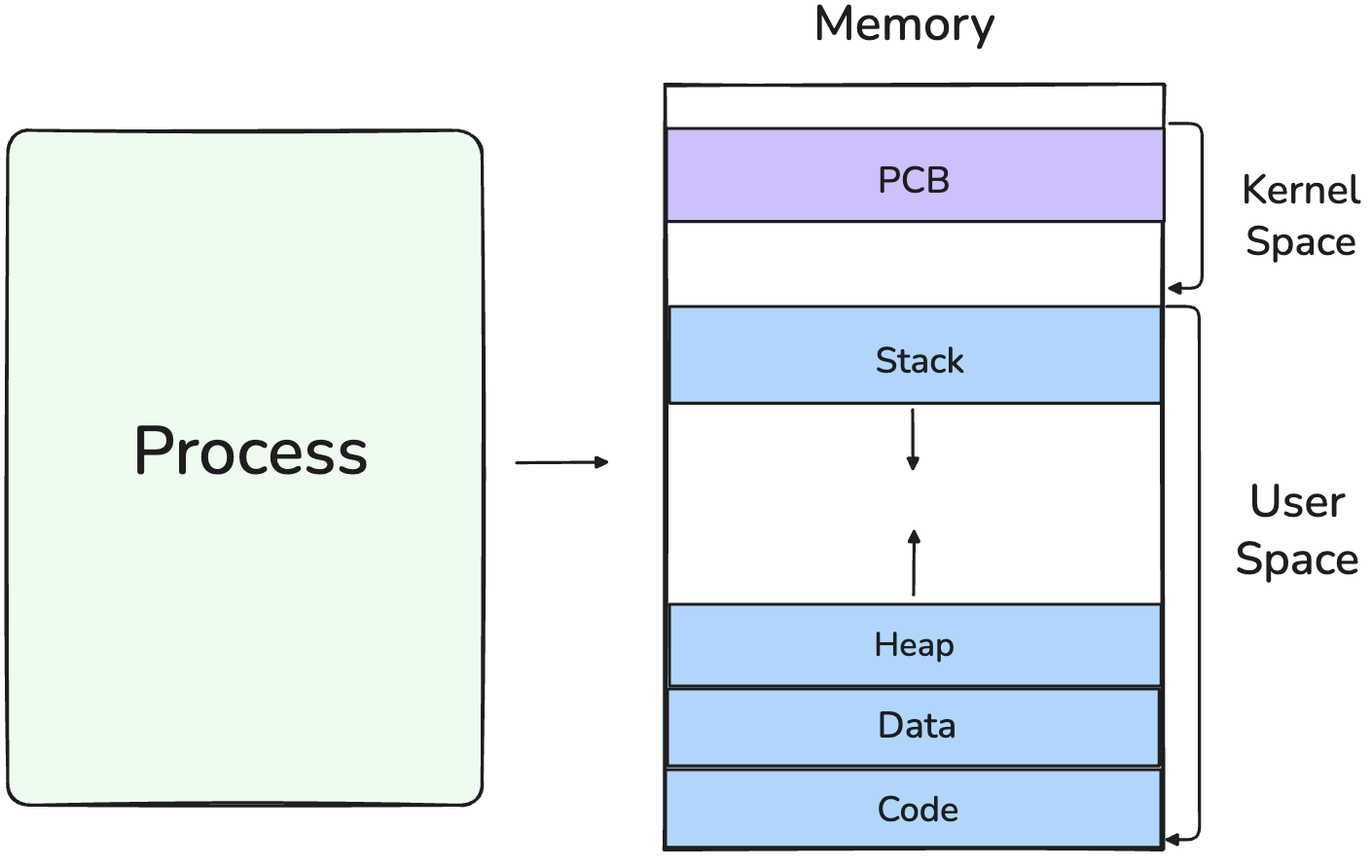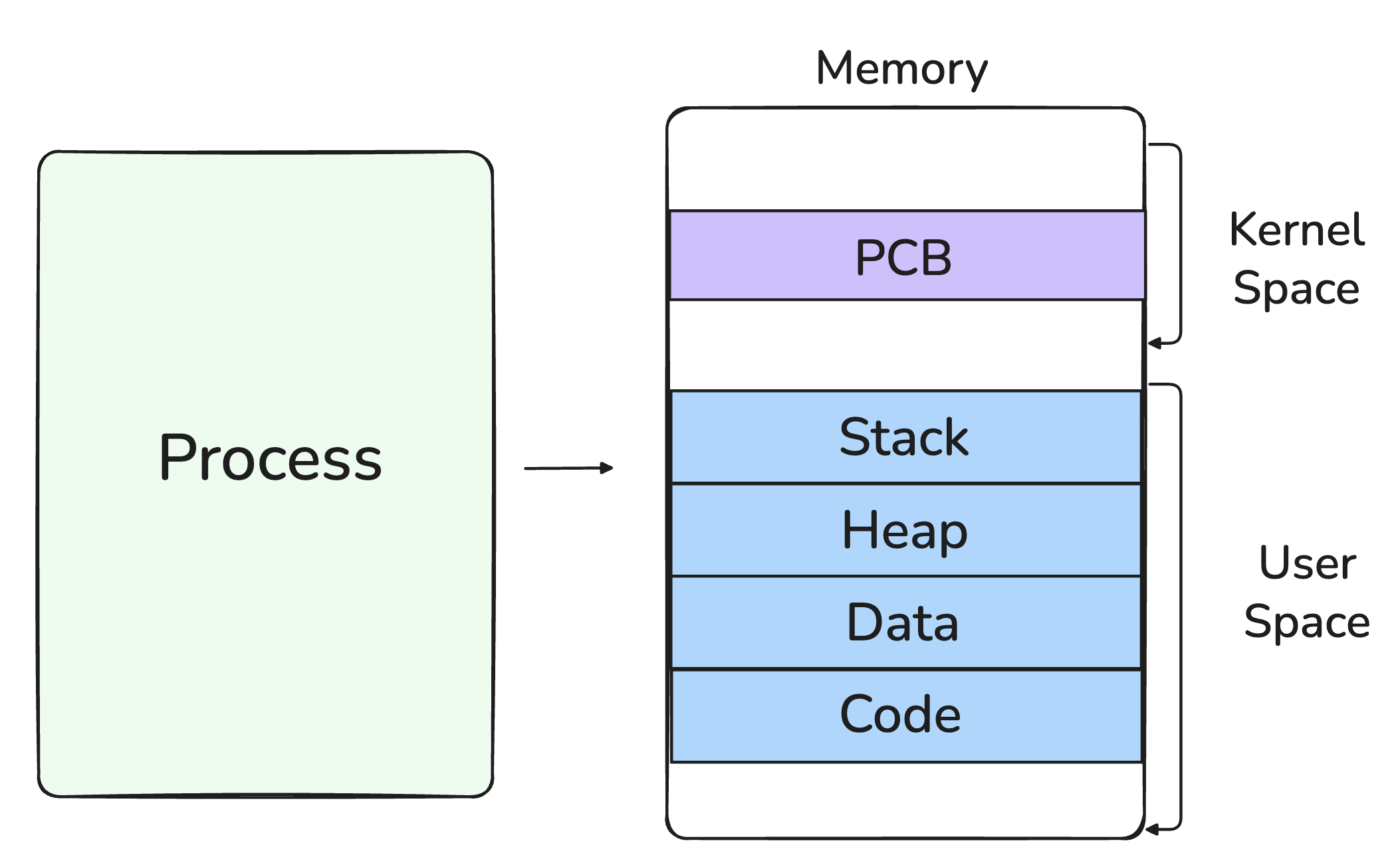 먼저 프로세스에 대한 기본 개념부터 알아보자. 프로그램을 실행하면 OS는 해당 실행 파일을 기반으로 하나의 프로세스를 생성하고 프로세스마다 독립적인 가상 메모리 공간을 할당한다. 커널 영역에는 이 프로세스를 관리하기 위한 프로세스 제어 블록(Process Control Block, PCB)이 생성되며 사용자 영역에는 실행 코드(Code), 전역 데이터(Data), 동적 메모리 영역(Heap), 호출 스택(Stack)으로 구성된 메모리 구조가 형성된다.