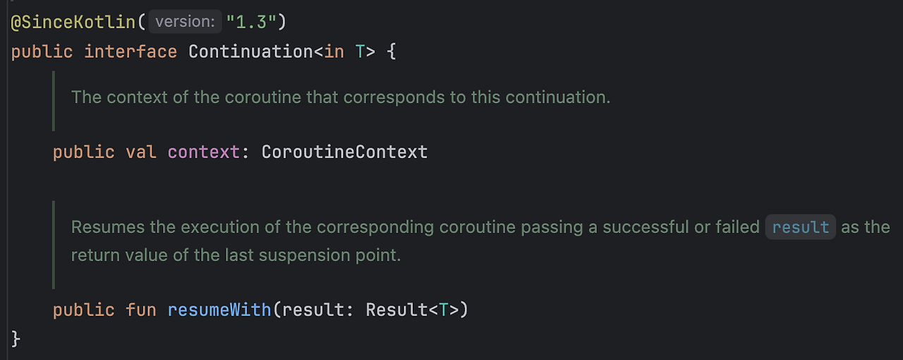코루틴이 협력적 스케줄링을 안전하게 구현할 수 있는 핵심에는 Continuation이라는 개념이 있다. Continuation은 코루틴의 실행 환경을 담은 CoroutineContext와 중단 지점 이후의 실행 흐름을 재개하기 위한 모든 정보를 담고 있는 객체다.
