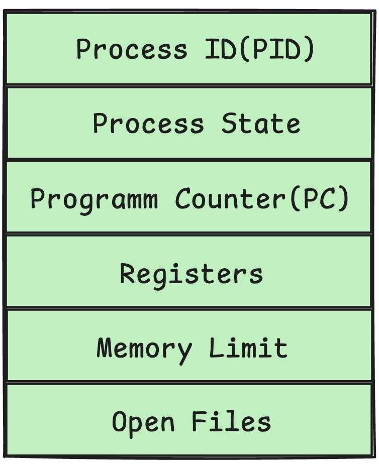 PCB는 OS가 특정 프로세스를 식별하기 위한 고유한 ID(PID)와 프로세스의 상태, CPU 스케줄링과 Context Switching을 수행하기 위해 필요한 모든 메타데이터를 담고 있는 자료구조이다.