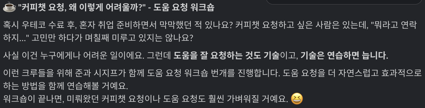 이런 고민들을 하던 찰나, 우테코의 코치님이신 준과 시지프께서 나와 같은 고민을 하는 크루들을 위해 도움 요청 워크숍을 열어주셨다.