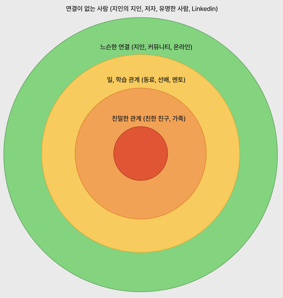 네 번째는 느슨한 관계다. 지인, 커뮤니티에서 알고 지내는 사람들, 혹은 가볍게 연락해 볼 수 있는 관계들이다.