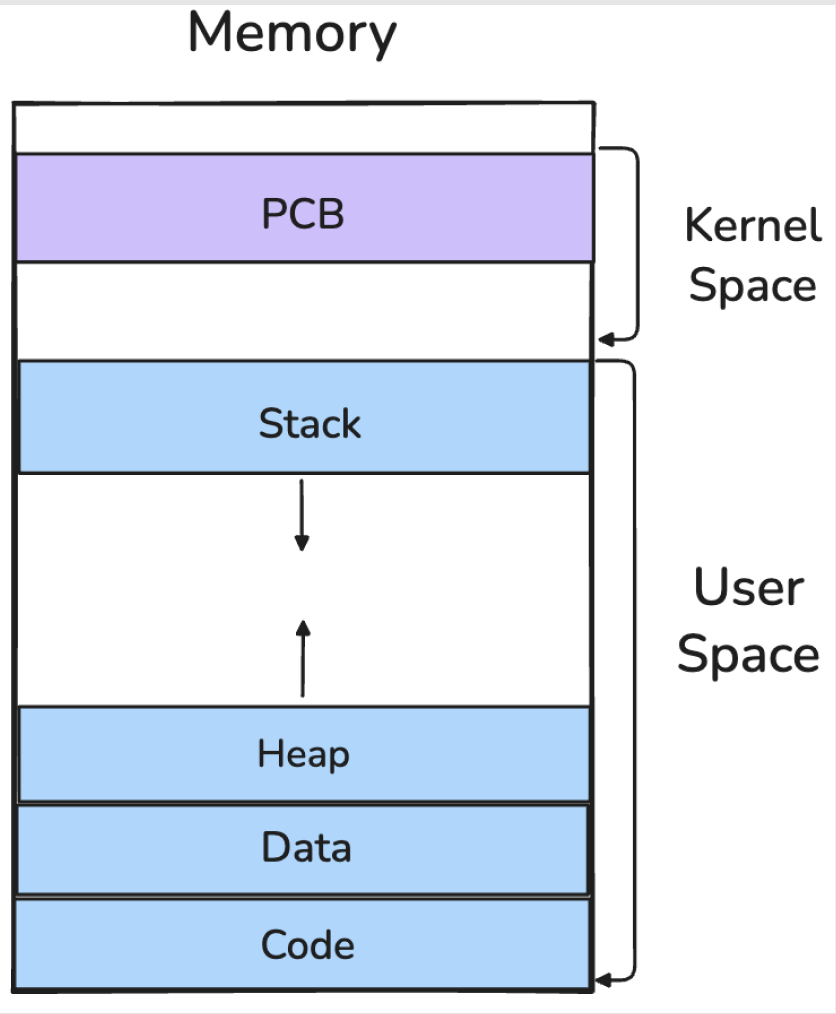 프로그램을 실행하면 OS는 해당 실행 파일을 기반으로 하나의 프로세스를 생성하고 프로세스마다 독립적인 가상 메모리 공간을 할당한다. 커널 영역에는 이 프로세스를 관리하기 위한 프로세스 제어 블록(Process Control Block, PCB)이 생성되며 사용자 영역에는 실행 코드(Code), 전역 데이터(Data), 동적 메모리 영역(Heap), 호출 스택(Stack)으로 구성된 메모리 구조가 형성된다.