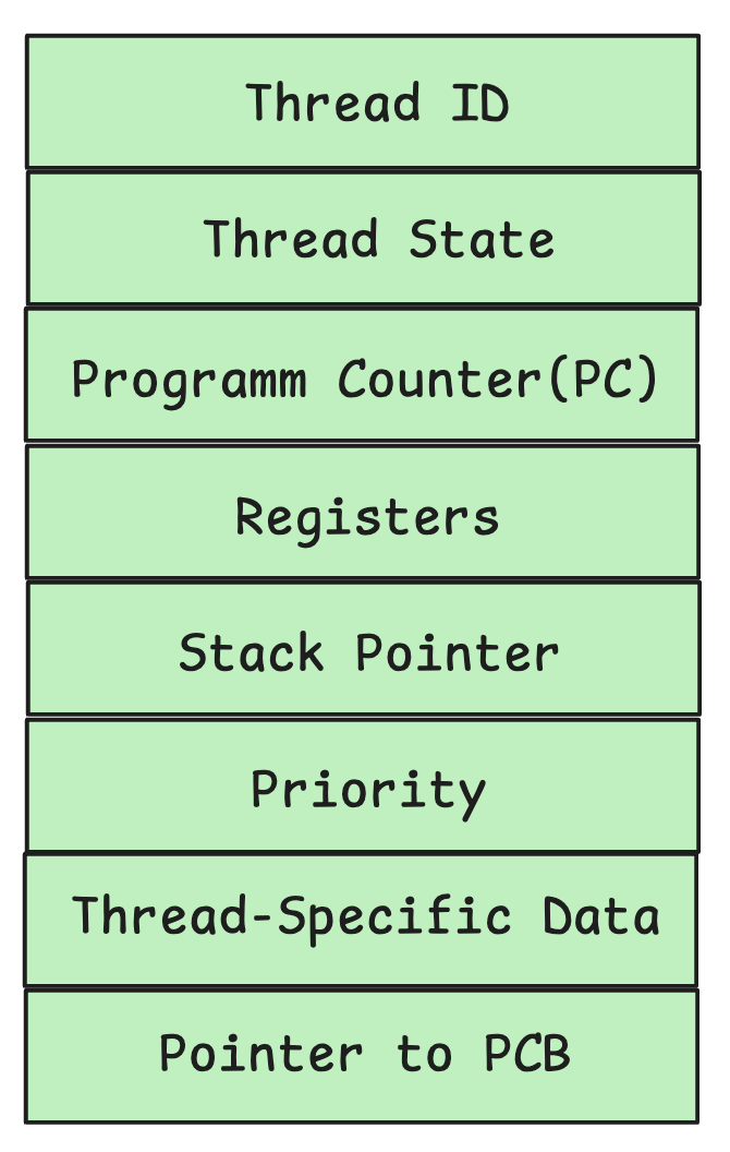 프로세스에 PCB가 있듯이, 스레드에도 스레드를 관리하기 위한 메타데이터를 담은 TCB(Thread Control Block)가 존재한다. TCB에는 스레드 ID, 스레드 상태, 레지스터 값, 스택 포인터 등 스레드 고유의 실행 정보가 저장된다. 다만 Code, Data, Heap 영역에 대한 정보는 프로세스의 PCB에 이미 존재하므로 TCB에는 포함되지 않는다.