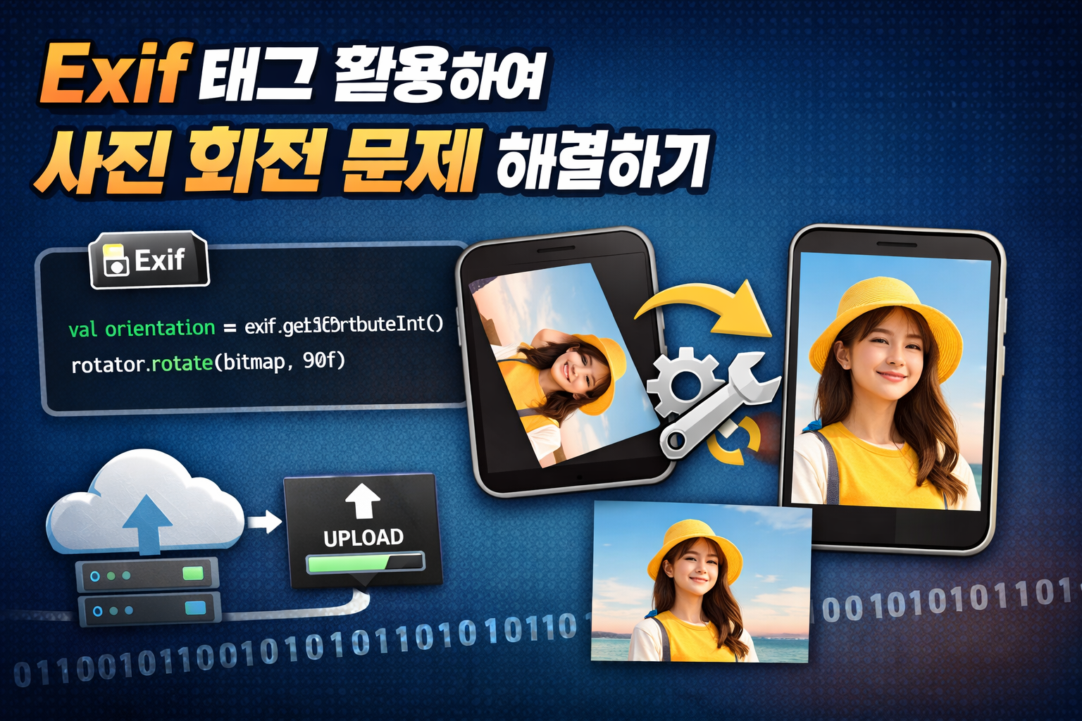 Exif를 통해 이미지의 Orientation 값을 확인했다면 해당 값만큼 실제 이미지를 회전시켜 주어야 한다. Exif는 단순히 “이 이미지는 90도 회전된 상태다”라는 메타 정보만 제공할 뿐, 실제 픽셀 데이터 자체를 회전시키지는 않기 때문이다. 따라서 업로드 전에 Bitmap을 직접 회전하여 픽셀 자체를 올바른 방향으로 보정하는 과정이 필요하다.