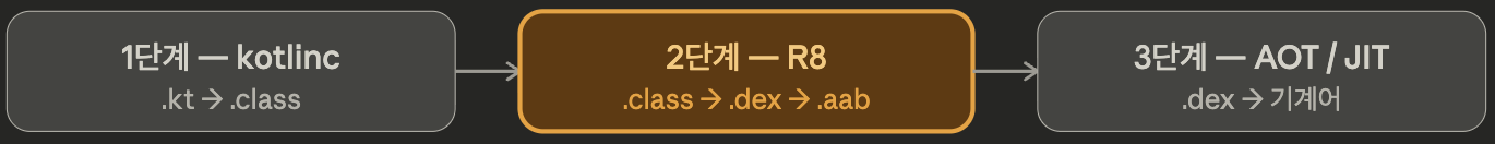 1단계에서 생성된 .class 바이트코드는 안드로이드 기기에서 그대로 실행되지 않기 때문에 DEX 형식으로 변환되어야 한다. 이 과정은 기본적으로 D8이 담당하며 릴리즈 빌드에서는 R8이 코드 축소·난독화·최적화를 수행하면서 DEX 생성 과정까지 함께 담당한다.