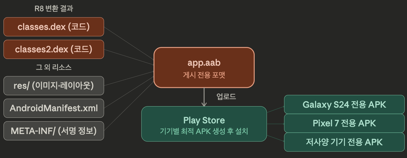 릴리즈 빌드에서는 필요에 따라 isMinifyEnabled = true로 R8의 축소·난독화·최적화를 적용하여 AAB(Android App Bundle) 형태로 배포되며 Google Play는 이를 바탕으로 기기별 최적화 APK를 생성해 전달한다.