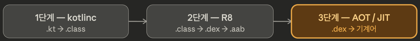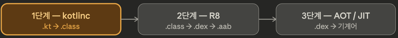 컴파일이란 사람이 이해하는 고수준 언어(e.g kotlin, java...)를 컴퓨터가 이해할 수 있는 0과 1로 이루어진 저수준 언어(기계어)로 번역하는 과정을 말한다. 코틀린으로 작성한 코드가 스마트폰에서 실행되려면 총 3단계를 거친다.