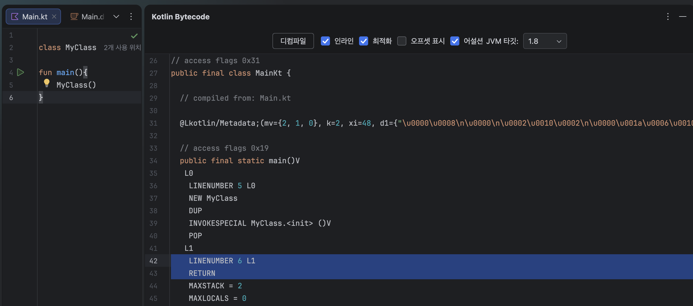 IDE의 기능을 활용하면 다음과 같이 Kotlin Bytecode를 확인할 수 있다. Kotlinc Compiler의 컴파일 과정은 다음 글에서 자세히 다뤄보겠다.