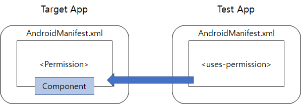 Test App에서 Target APP의 컴포넌트를 실행한다고 가정했을 때, Target App에서 해당 컴포넌트의 <permission> 을 부여했다면 testApp에서 해당 컴포넌트를 실행하기 위해선 반드시 <uses-permission> 을 선언해 사용해야 합니다.