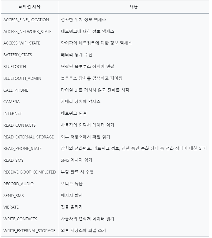 시스템 퍼미션은 특정 기능을 OS에서 보호하고 있어 앱에서 사용할 때 <uses-permission> 을 선언 해줘야 합니다.