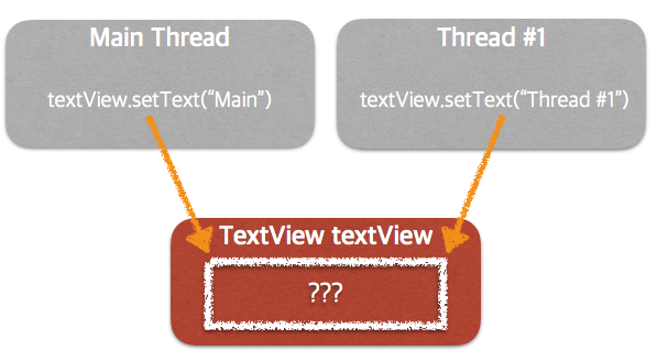 - 메인 스레드와 다른 스레드 두 개 이상의 스레드가 같은 텍스트뷰에 setText()를 시도한다면 둘 중 어떤 스레드의 setText()가 적용될지 알 수 없고 이렇게 되면 사용자는 둘 중 하나의 값만을 볼 수 있어 다른 한 스레드의 결과는 버려집니다.