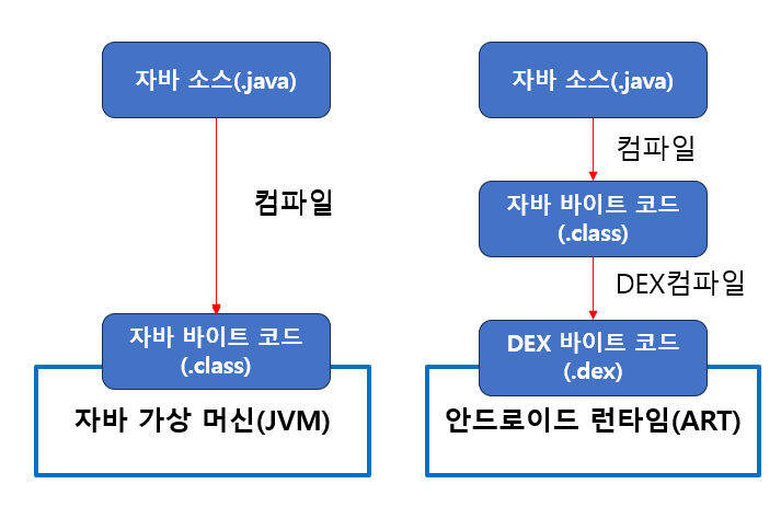 - ART : AOT(Ahead-of-Time) 컴파일러를 사용해 앱 설치시 미리 기계어로 번역해 실행 시간이 Dalvik보다 빠릅니다. ART는 DEX 파일을 실행해 저용량 메모리 기기에서 여러 VM을 실행하도록 설계되었습니다. DEX 파일은 안드로이드용으로 설계된 바이트 코드 형식으로, 최소 메모리 공간에 맞게 최적화돼 있습니다.