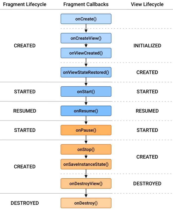 Activity Life Cycle과 비교했을 때 추가된 몇가지 콜백 함수를 확인할 수 있습니다. 생성 프로세스에서는 onCreateView(), onViewCreated(), onViewStateRestored() 함수가 있고 종료 프로세스에선 onDestroyView() 가 추가 됐습니다.