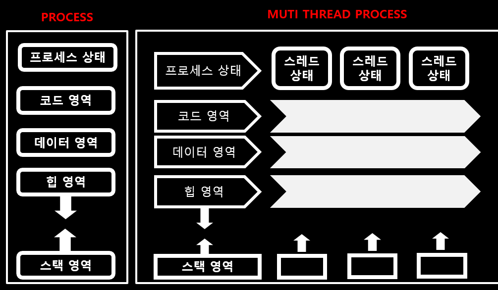 스레드는 프로세스 내에서 독립된 Stack을 할당받고 Code, Data, Heap 영역은 다른 스레드와 공유합니다. 이 말은 한 스레드가 프로세스 내의 공유 자원을 변경하면 프로세스 내부의 다른 스레드도 즉시 변경 결과를 확인할 수 있습니다.