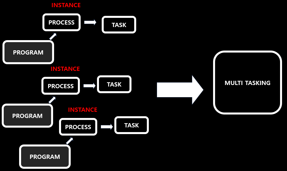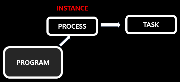 - 먼저 MS Word 프로그램을 실행한다고 가정해 보겠습니다. 프로그램을 실행하면 운영체제의 프로세서가 하나의 인스턴스를 생성하는데 이 것을 Process라고 하며 이 일련의 과정을 하나의 Task라고 표현합니다.