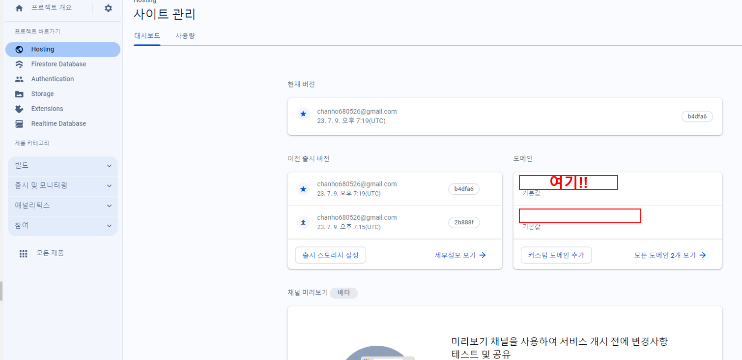 ✅ 왼쪽 메뉴에서 Hosting을 선택 해줍니다.