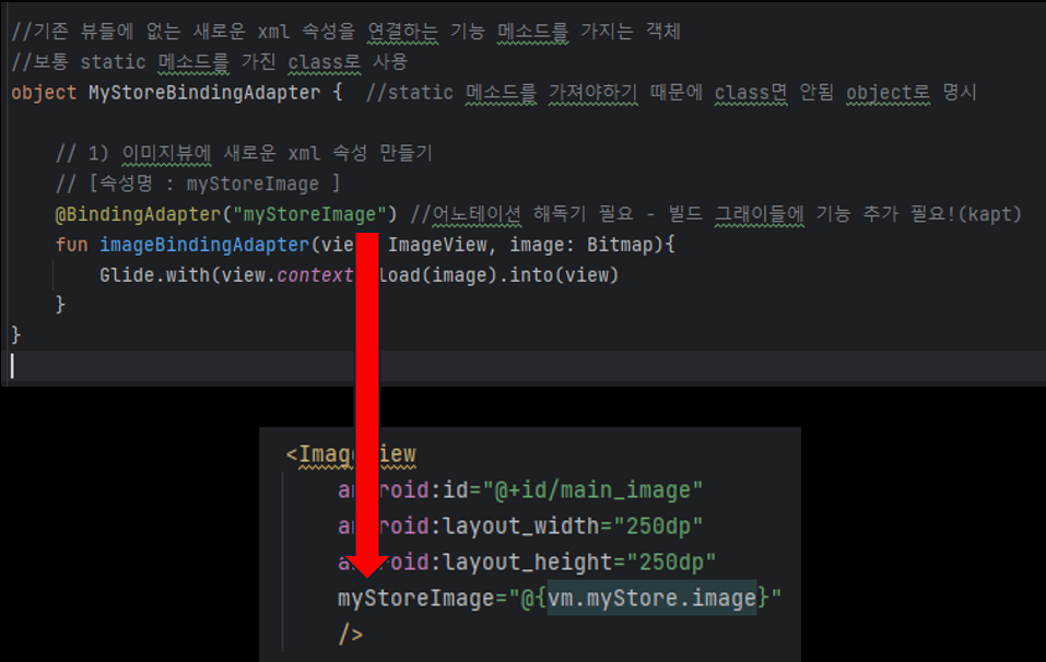 - @BindingAdapter을 사용해 직접 원하는 속성을 만들어 이미지를 바인딩할 수 있습니다.