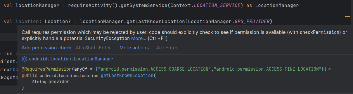 val location: Location? = locationManager.getLastKnownLocation(LocationManager.GPS_PROVIDER)
