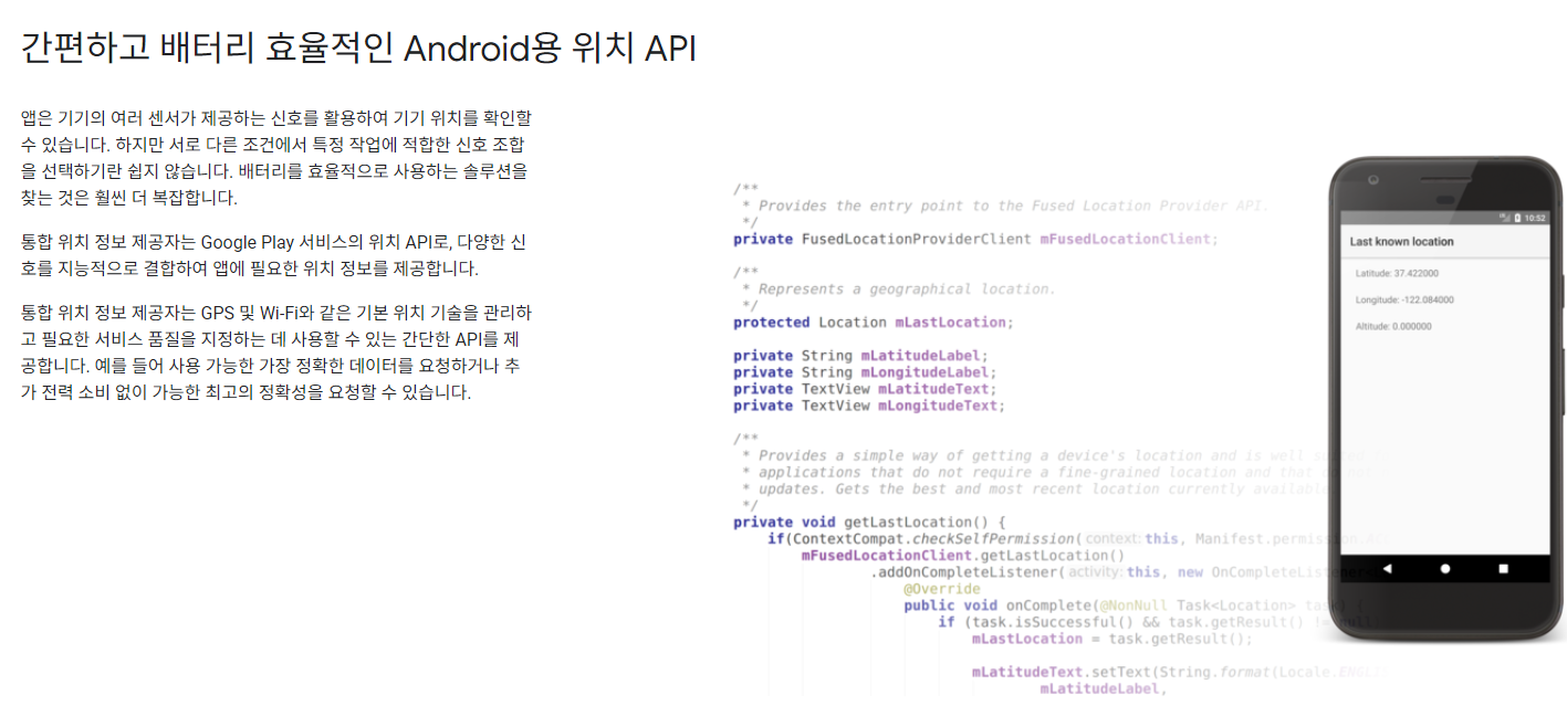 또한 API 안내 사이트를 확인해보면 간편성과 배터리의 효율을 강조하고 있습니다. 이는 위에서 언급한 Android Location service의 단점을 보완할 수 있습니다.