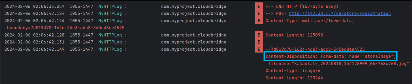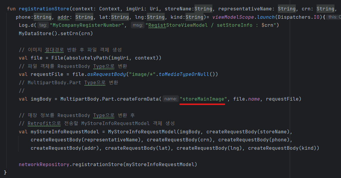 httpLoggingInterceptor를 사용해 로그를 분석하다 이상한걸 발견했습니다. 서버에 전송될 때 필드 네임이 storeMainImage이 아닌 storeImage로 전송되는 것이었습니다!!