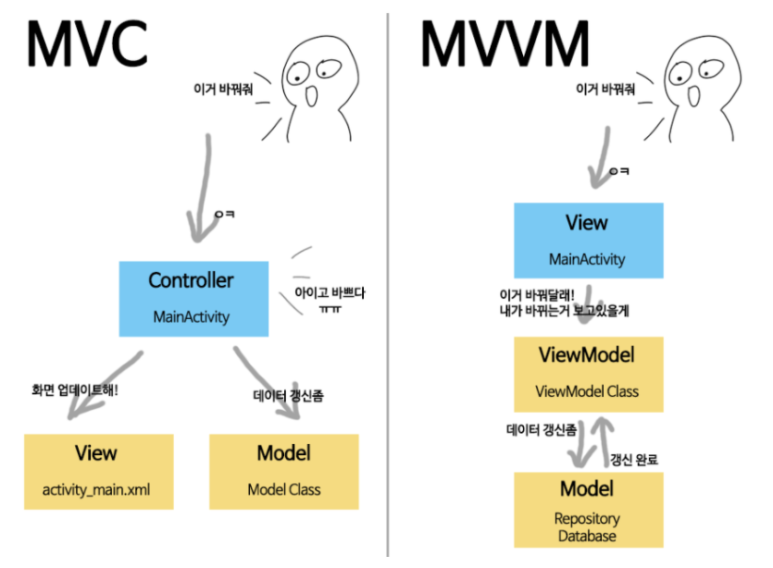 MVVM 은 Model - ViewModel - Model 의 약자입니다. 위의 소프트웨어 아키텍처에 대입하면 조금더 이해가 쉬울 것 같습니다.